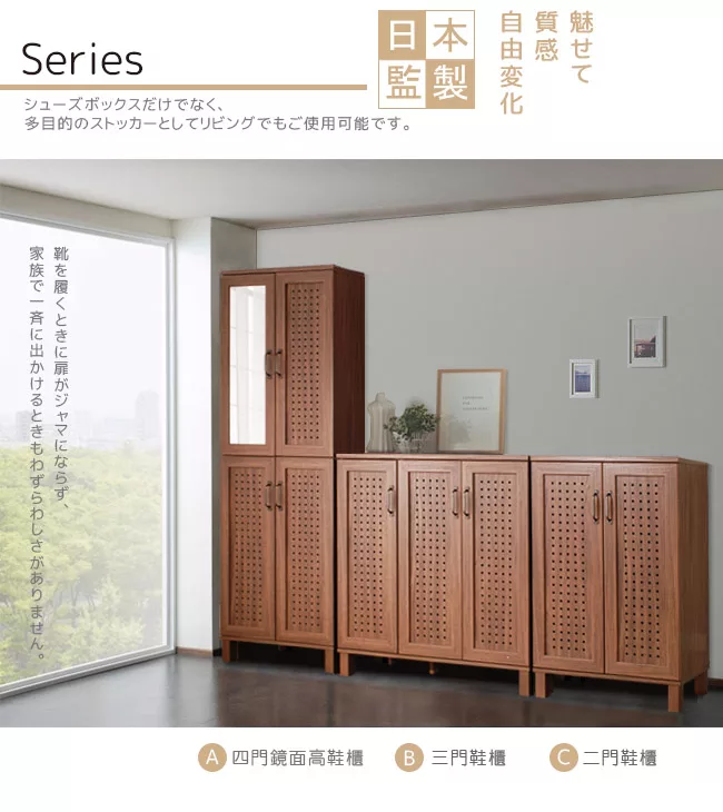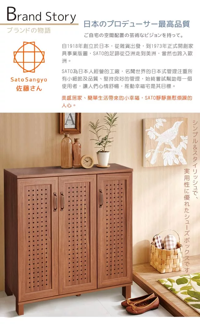 【Sato】日本品牌,職人精神的手工、講究獨特的細緻、質感上乘的細節、豐富變化品味極致。寬度87公分加寬尺寸,鞋櫃內深度達33公分,男鞋或大尺寸女鞋也放得下,全家大小的鞋子皆可收納。三門8層板,大小層板搭配,可收納20雙各類鞋款,排孔設計任意調節層板高低,無論是高筒靴、高跟鞋、球鞋、男鞋、大尺寸鞋...設想周全,L型五金穩固側邊與層板,100%穩定不位移,螺絲孔皆附有冒蓋,細微處也注重美感。