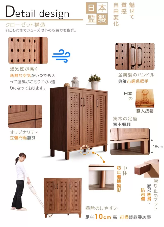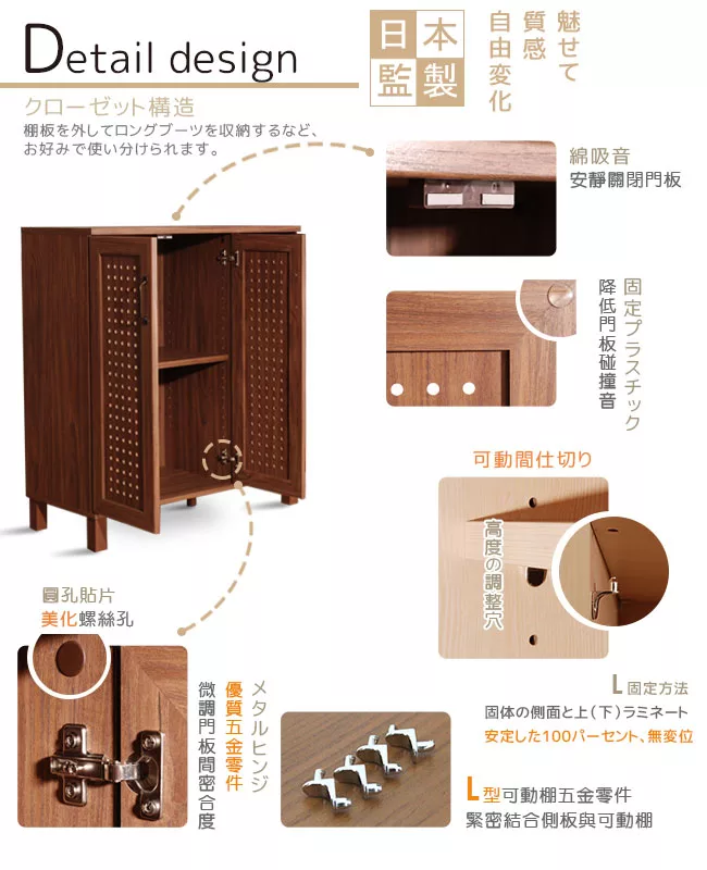 立體門框設計,櫃面與兩側採用仿木紋紙皮,呈現質感觸感光滑,圓孔設計透光透氣且防潮,搭配復古風格的金屬古銅把手,實木腳質感醇厚大器,無銳角設計安全質感融合整體居家更潮。使用消音棉及軟墊,貼心降低關門噪音與避免關門時碰撞的風險,在細節處處用心,使結構更為穩固。嚴選頂級五金絞鏈,經非常多次的開合也不易鬆脫,腳座10cm高度,打掃輕鬆零灰塵,實木櫃腳附腳墊防刮防滑。