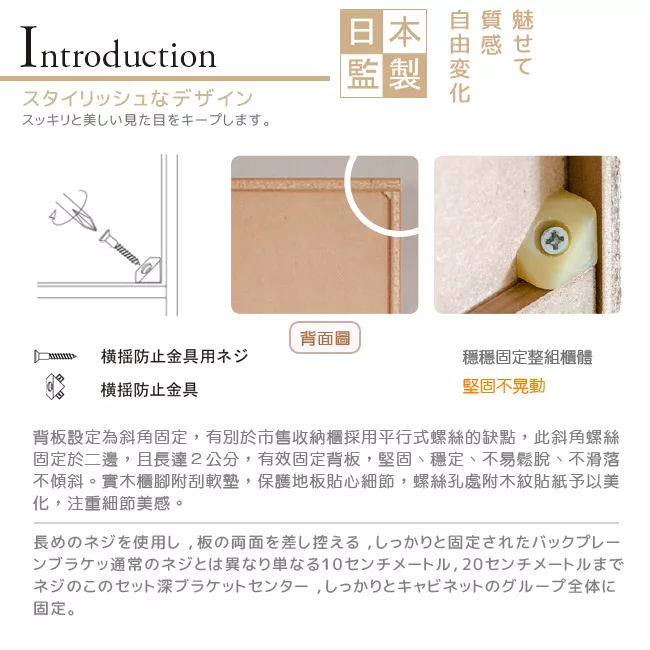 【Sato】日本品牌,職人精神的手工、講究獨特的細緻、質感上乘的細節、豐富變化品味極致。蜂巢板高級木紋化妝紙,內部蜂巢板具有高平坦性、隔音、隔熱及質輕等特徵,承重力的強度高、剛性優越,隱約看見科技產品與人文質感間的完美融合。設計上講求「恢復休養感官的空間」為靈感,讓每個人都能找回真樸的自我。背板設定為斜角固定,有別於市售收納櫃採用平行式螺絲的缺點,此斜角螺絲固定於二邊,且長達2公分,有效固定背板,堅固、穩定、不易鬆脫、不滑落、不傾斜,螺絲孔處附木紋貼片予以美化,細微處也注重美感。